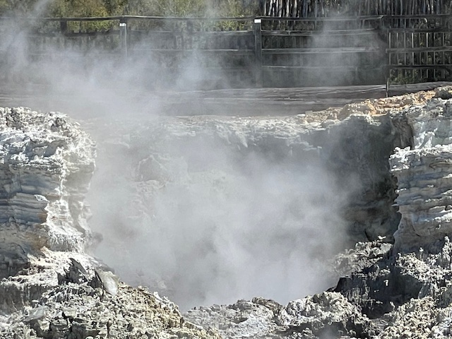 We started the day on an excursion to see the town, and then traveled to Rotorua, a geothermal area known for its bubbling mud baths, geysers, and hot springs, all fueled by intense heat from the volvanic activity deep below ground. We also learned how the ancient Maori considered this area Hell’s Gate and worshipped many gods associated with the area.