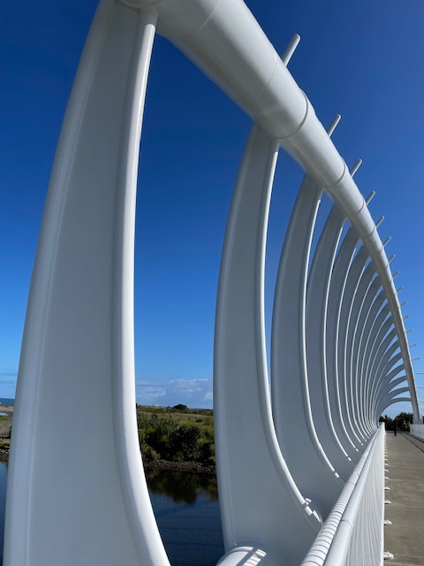 Port Taranaki is the only deep-water port on the North Island’s west coast and plays an important part in the industrial development of the region’s oil and gas resources. From the port area, we toured a 7-mile Coastal Walkway which winds along the coastline, along the city front and its beaches, to the dramatic curved-rib architecture of the Te Rewa Bridge. In the distance was the snow-capped pyramid of Mt. Taranaki, a site sacred to the local Maori.