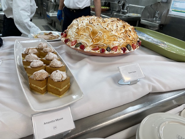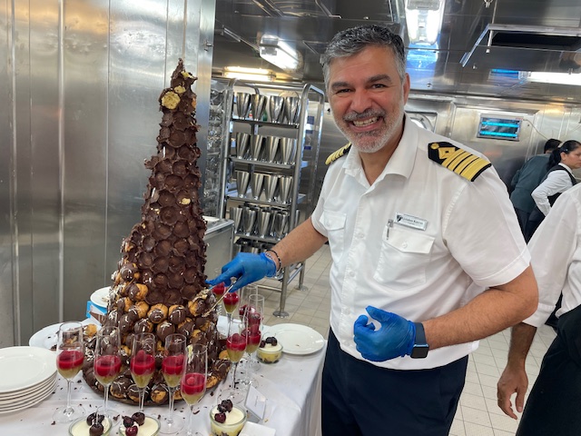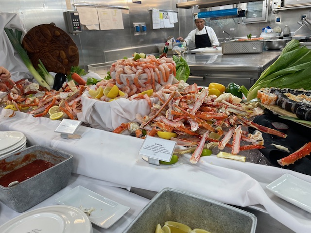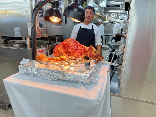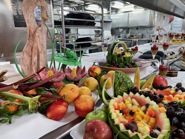 Our sea days were very relaxing, but there were a few special events. On Feb 16, 2024 we were treated to a Seabourn Signature Event — the Galley Market Lunch. This lunch is held in the main restaurant, but it is a buffet in which we were able to take our plates through the galley and enjoy all of the wonderful offerings prepared by the amazing chefs and culinary artists. Some of the items are shown below. The person serving one of the desserts was our Captain.