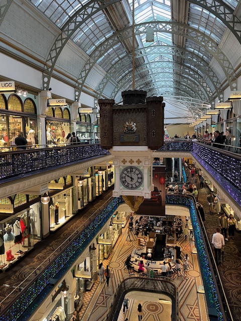 On our second day in Sydney it rained, and we were on our own, so we decided to take a shuttle into the center of town and explore by ourselves. In a downpour, we ventured out from the shuttle terminal and started walking, eventually ending up at the Queen Victoria Building, an historic building that was recently completely renovated into a beautiful shopping center that covered a full square block and was three stories tall. The entire shopping center was full of high-end stores and places to eat. Every floor had extensive stained glass and marble, and there was a huge clock tower in the center of the complex.