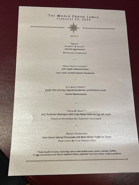 On Feb 23, 2024, we continued to sail north in the Coral Sea along the east coast of Australia. It was another relaxing, peaceful day with much good food, and good weather. For lunch we were invited to a special meal at the Thomas Keller Grill. It was a five-course spread especially prepared by the chef for passengers on the World Cruise.