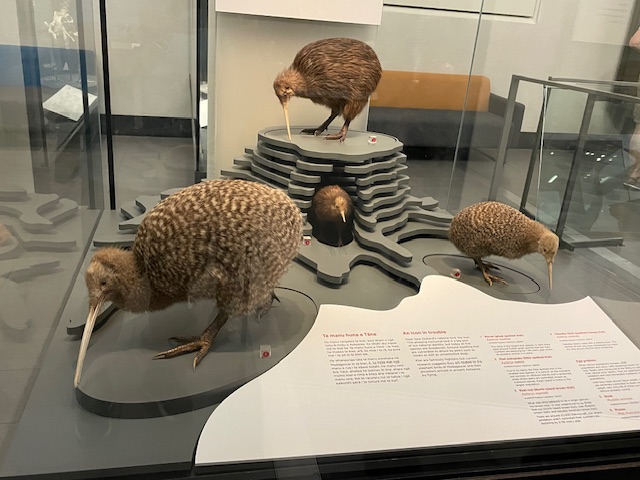 The first and third floors contain many objects and displays that show the development of the country, with many aspects of the Maori civilization. There are also displays of extinct (and nearly extinct) native birds, including the native giant Mao (now extinct) which stood over three meters (over 10 feet) tall, and the native national bird, the Kiwi — both shown below.